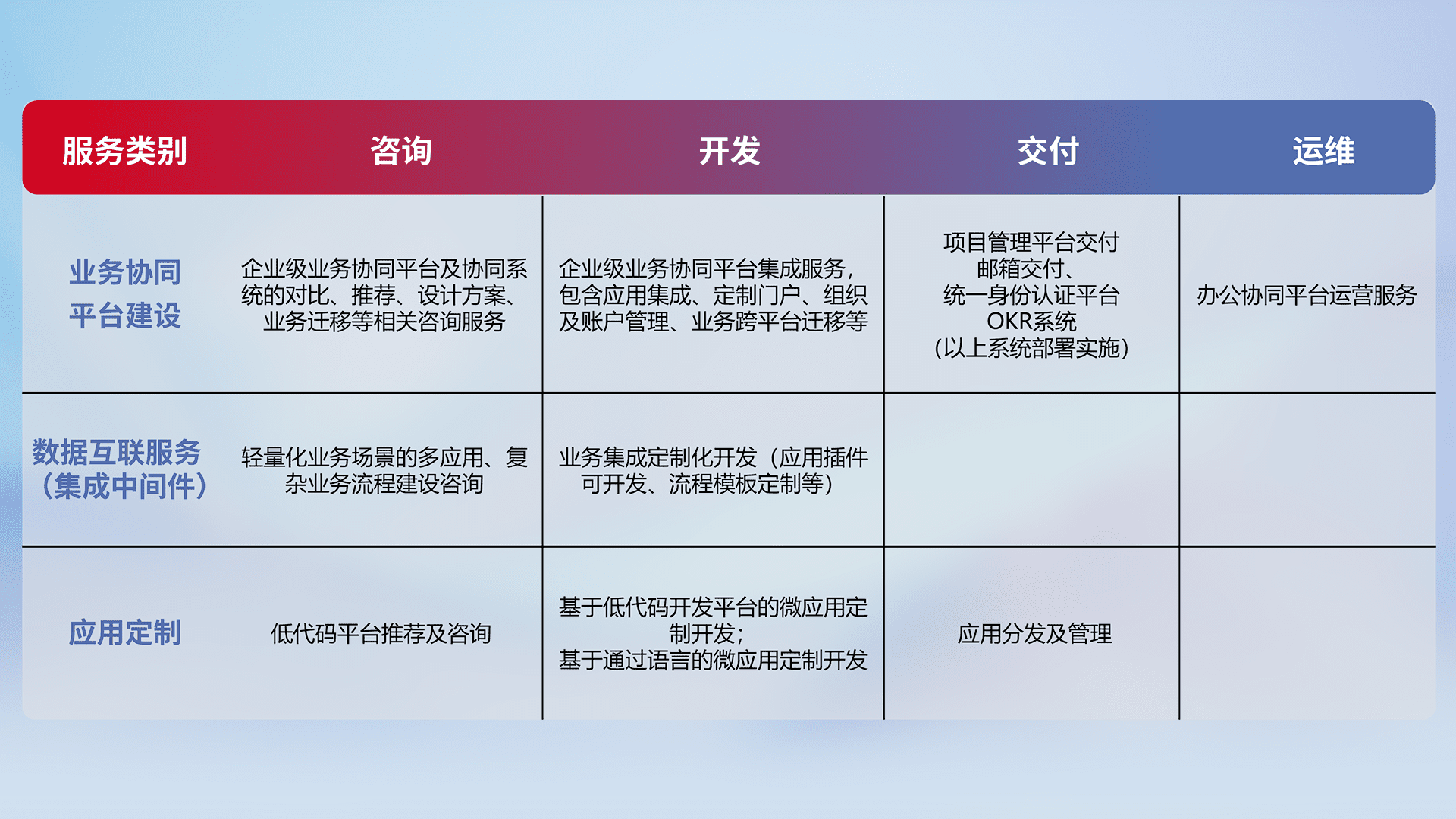 针对钉钉、、、企微、、、、IDaas等平台级产品提供产品的规划、、、、方案、、、、交付、、、定制化开发等服务,,实现如统一协同办公、、智能客户服务、、混合会议管理、、智能数据查询、、等业务场景,,,,实现数字化转型。。。