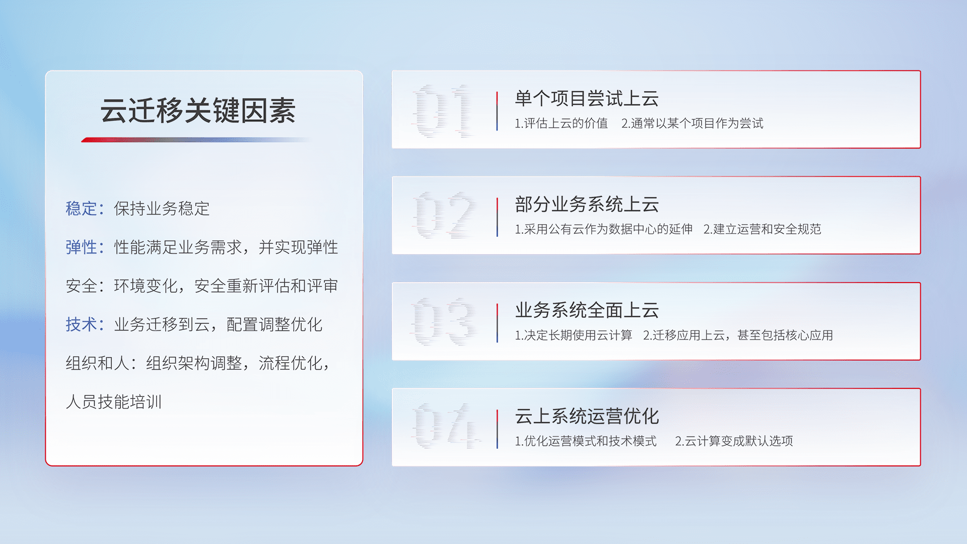 结合实际业务,,,,从规划设计、、、云平台选型、、、云原生改造、、、数据迁移、、、集成交付,,迁移全过程为客户识别最佳上云路径,,做好风险识别管理,,,,设计网络架构、、、、身份权限、、安全审计合规、、操作审计、、日志审计、、监控告警策略、、、、多站点容灾设计等,,对云上基础设施进行整体规划,,,提升IT治理水平,,,以满足弹性、、高可用、、高性能的需求。。。。