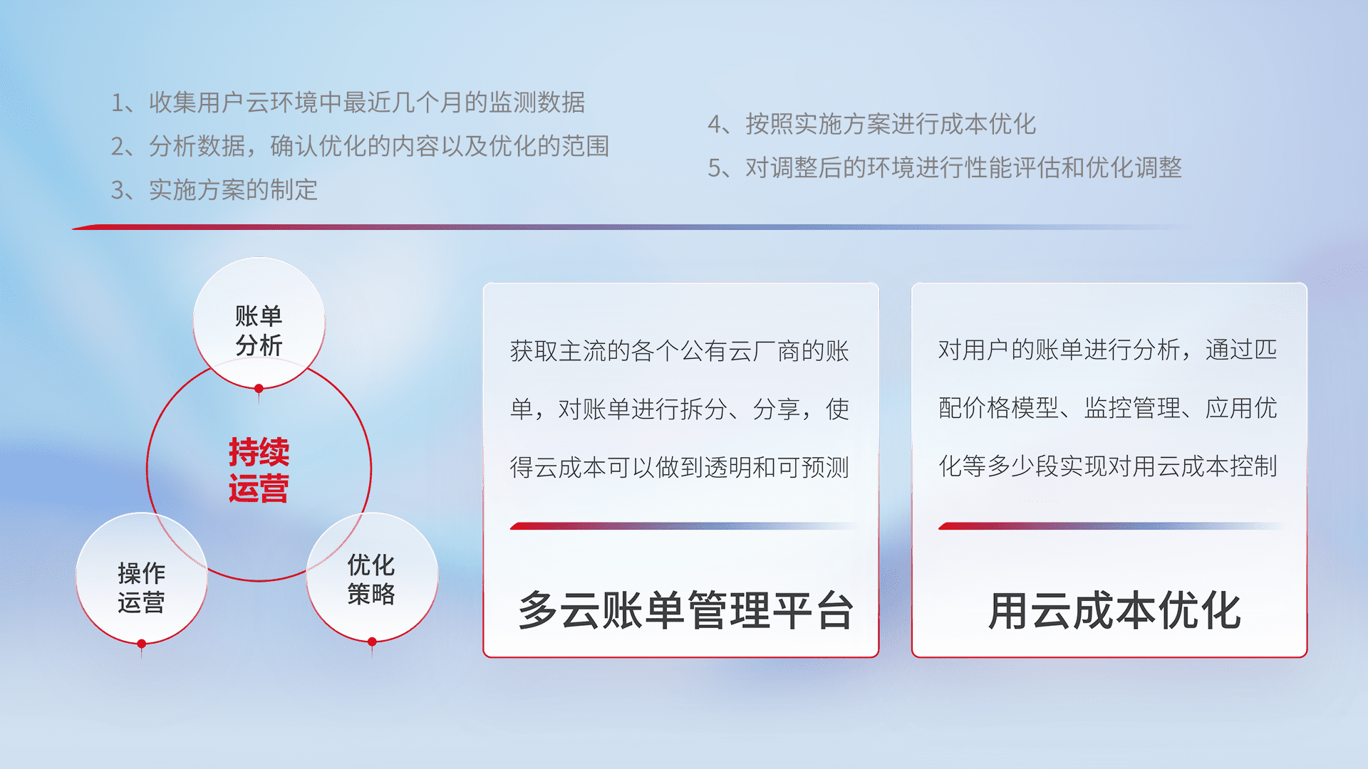 通过灵活运用多种自动化迁移工具,,帮助企业用户实现业务和数据高效 、、、稳定的上云迁移和云上迁移,,,采用自研多云纳管平台,,,以中立管理模式,,解决多组织、、多云、、、、多运维厂商的复杂关系的管理,,,,保证多云平台资源配置的一致性,,,实时掌控云资源运行数据,,,运用智能化工具分析云资源多云平台的管理服务,,,,透明化管理成本支出,,用云成本可预测、、、、用云费用可优化、、云资源配额有据可依。。
