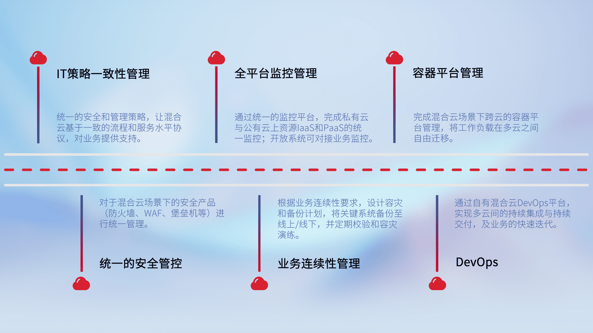 通过多云纳管,,,,以统一的资源数据模型把客户的云资源进行抽象和封装,,进而实现对多云资源的统一操作,,,保障云资源管理的可靠性、、、稳定性与可用性。。。。量身定制化运维内容,,,配置、、开发运维、、、、补丁管理、、备份、、、、监控、、、认证和访问管理、、、审计和日常巡检等,,,保障在用云过程中的可靠度,,稳定度以及高可用率。。。